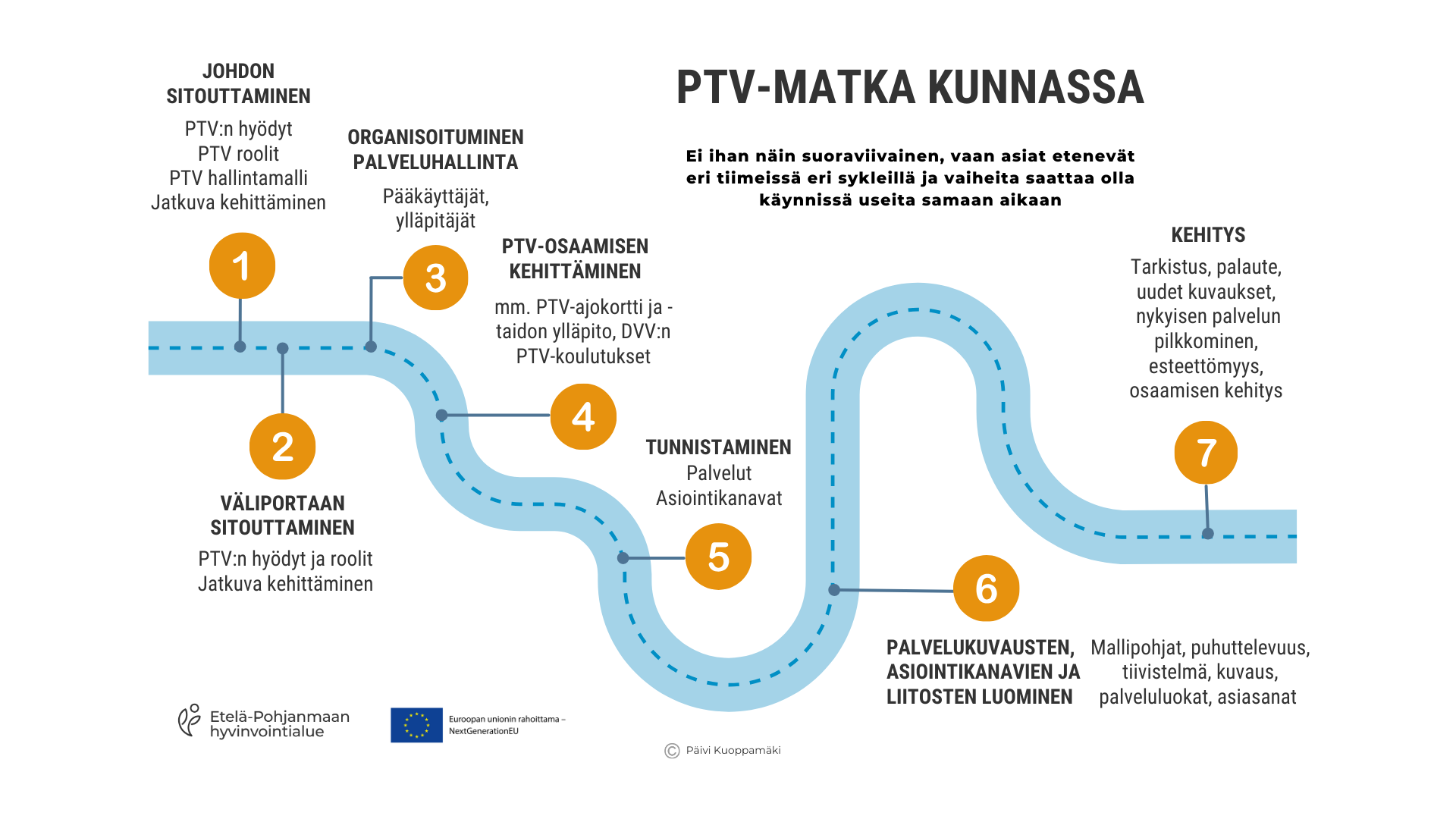 Hyvinvoiva Etelä-Pohjanmaa -hankkeen aikana hankkeen PTV-tiimi tuki vieraili alueen kunnissa ja opasti miten Palvelutietovarannon käyttöä voi vahvistaa ja miten kansalliset verkkopalvelut hyödyntävät Palvelutietovarantoon vietyä tietoa. Hankkeen aikana järjestettiin kunnille useita infotilaisuuksia sekä PTV-työpajoja, joissa konkreettisesti opastettiin PTV-kirjausten tekemisessä.