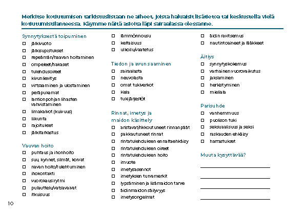 Merkitse kotiutumisen tarkistuslistaan ne aiheet, joista haluaisit lisätietoa tai keskustella vielä kotiutumistilanteessa. Käymme näitä läpi sairaalassa ollessanne. Tulosta oma kotiutumisen tarkistuslista tästä linkistä.