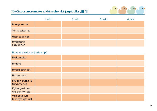 – tarvitset lisäohjeita tai tilannearviota rintojen tiehyttukoksen tai tulehduksen oireiden hoitoon. Hoida rintoja tämän oppaan ohjeiden mukaisesti, tyhjennä rintaa usein ja ota säännöllisesti kipulääkettä.